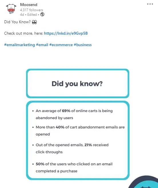 Moosend used LinkedIn to share a few interesting stats related to email marketing. In addition to highlighting the key numbers in a visual format, they linked to a blog post that provided more in-depth information.