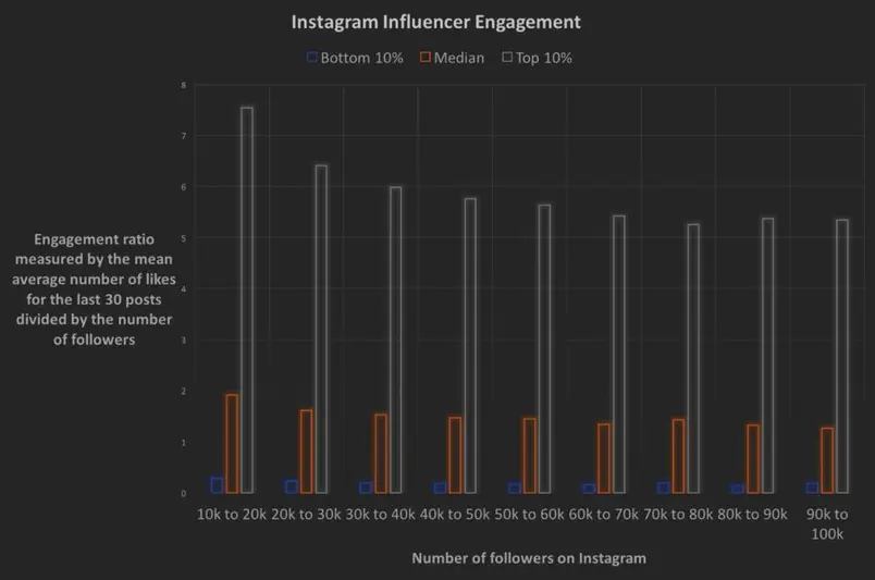To answer this question scientifically, we analysed the engagement ratio for a random sample of over 100,000 Instagram influencers drawn from the Moju database. In the chart below, the engagement ratio is shown for the bottom 10% of influencers (blue), the median influencer (orange) and the top 10% of influencers (white).
