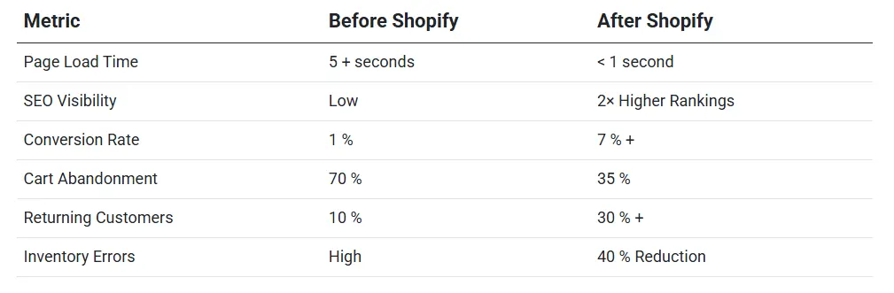 Within 90 days, La Enviro’s e-commerce performance flipped: page loads dropped from over 5 seconds to under 1 second, conversion rate jumped from 1% to above 7%, and cart abandonment fell to 35%. Inventory errors dropped by 40%, repeat customers grew from 10% to over 30%, and automated email flows recovered 20% of previously lost sales.
