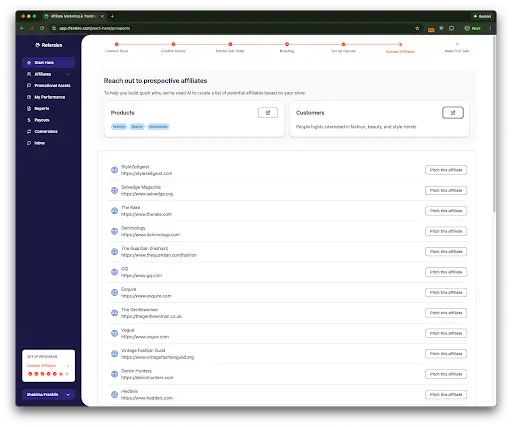Unlike traditional affiliate marketplaces that rely on keyword searches or manual outreach, Refersion’s approach surfaces partners automatically during signup. Merchants see suggested affiliates as they configure their account, making partner recruitment part of onboarding rather than a separate workflow.