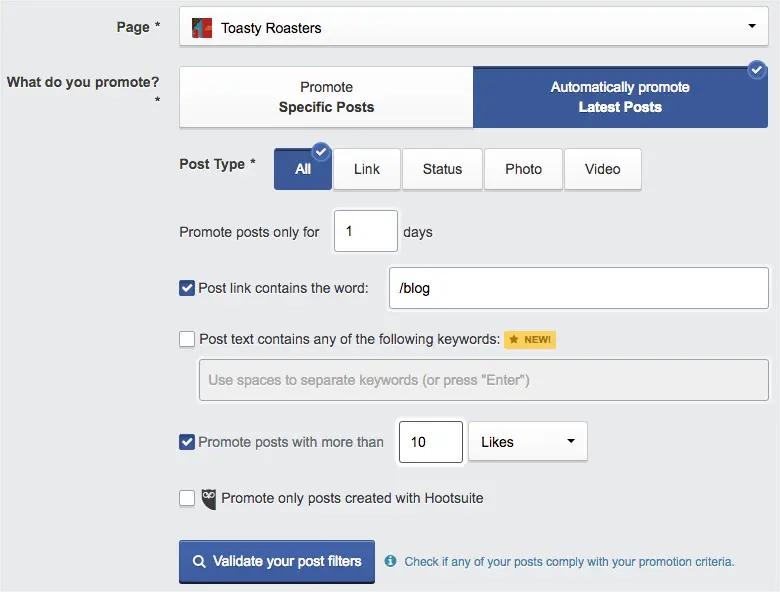 Another automation that AdEspresso handles is promoting posts. Having to go through the motions with Facebook Ads every time there’s a post you want to promote can get frustrating, to say the least. When you select a campaign in AE designed to promote a post, you can choose one right then and there, or just give it some criteria that qualifies which posts get promoted. For example, you could specify only posts with the word “Sale” in it, or only posts that get a certain number of likes, or only posts that contain a specific URL. You can set any of these criteria, and then AdEspresso monitors all your latest content as you post them; if one matches your criteria, it will automatically get promoted to a targeted audience you define and within the budget you set.