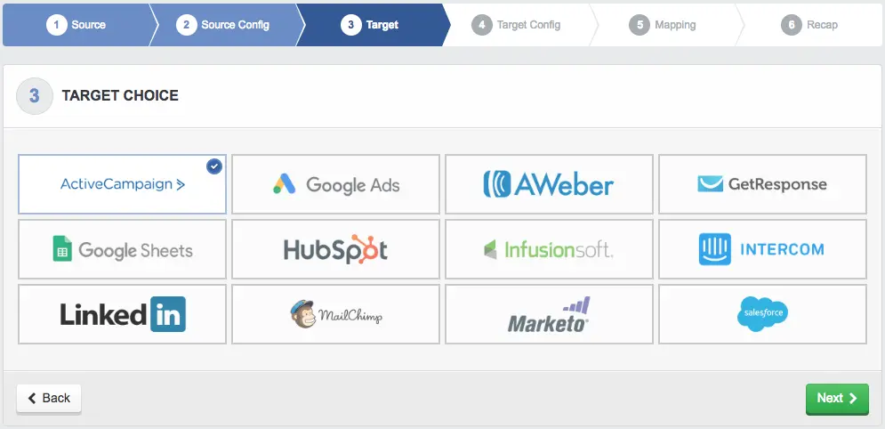 You’ll be able to connect AdEspresso with the following platforms for syncing contact data: ActiveCampaign, Aweber, Get Response, Google Ads (sync target only), Google Sheets, HubSpot, InfusionSoft, Intercom, Mailchimp, Marketo, and Salesforce.