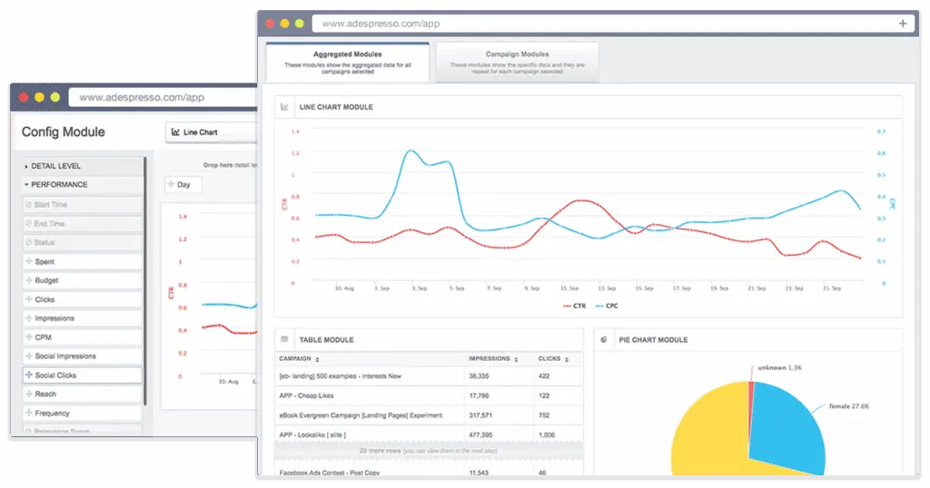 You can use provided templates, or create your own from scratch, and you’ll get metrics on far more than what Facebook offers in its own Ads Manager. FB reports are concerned with CPAs only—how much did you spend per impression, or per click? The FB reporting mainly wants you to know what a good deal you got, like: “Look how little you spent per click! Yay, Facebook!” On the other hand, AdEspresso wants you to know what you want to know: how did these ads impact your business and help you reach your goals. So your reports will contain real achievements, like the sales revenue you generated from your last boosted post pushing a new product. Or how many signups you got from your last ad trying to generate leads.