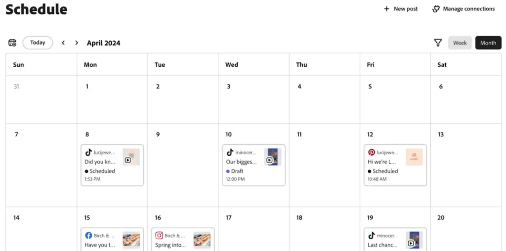 The Content Scheduler inside Adobe Express provides a unified calendar that displays every upcoming post across all connected channels. This solves one of the biggest coordination problems for brands: having TikTok drafts in one system, LinkedIn posts waiting in another, and Instagram Reels stored separately.