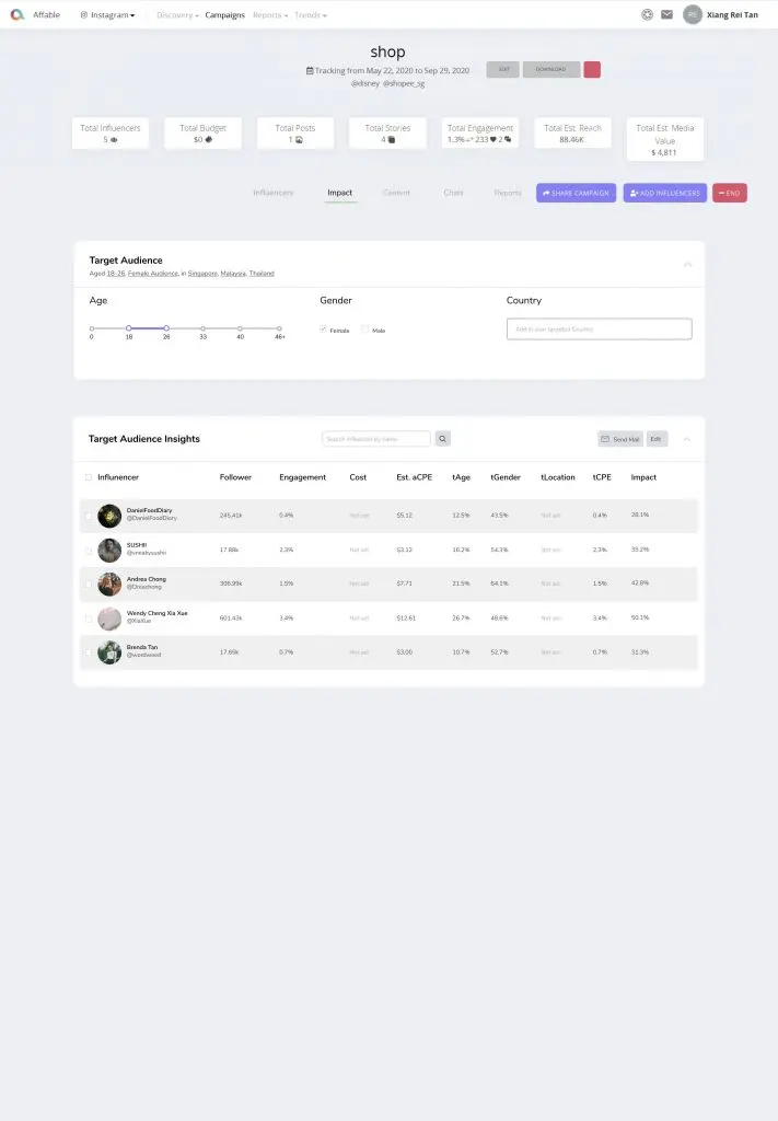The reports help you identify your target audience and the influencers who will be best equipped to reach them again. Say, for example, you’re an Affable client trying to reach an audience in Singapore. Your reporting tells you that overall, only 40% of your engaged audience is located there—this becomes the number to beat the next time around. You can then look through your reports to find all the influencers who exceeded that average and re-engage with them, and only them, knowing that a much higher percentage of your audience is going to be where you want them to be. This information can also be used as leverage for future negotiations (or future savings). Perhaps there’s an influencer who has 100,000 followers and wants to be paid accordingly. But your campaign report shows you that only 5% of those followers actually engaged, and half of those people were in countries where you don’t do business. It doesn’t make sense to pay 100k Follower prices when there are only 2,500 people who meet your targets and engage with the content. Affable also uses all this data to generate what’s called an Impact Report, which—by focusing only on results with those people in the middle of the funnel—gives you a much truer picture of how much it costs to reach them.