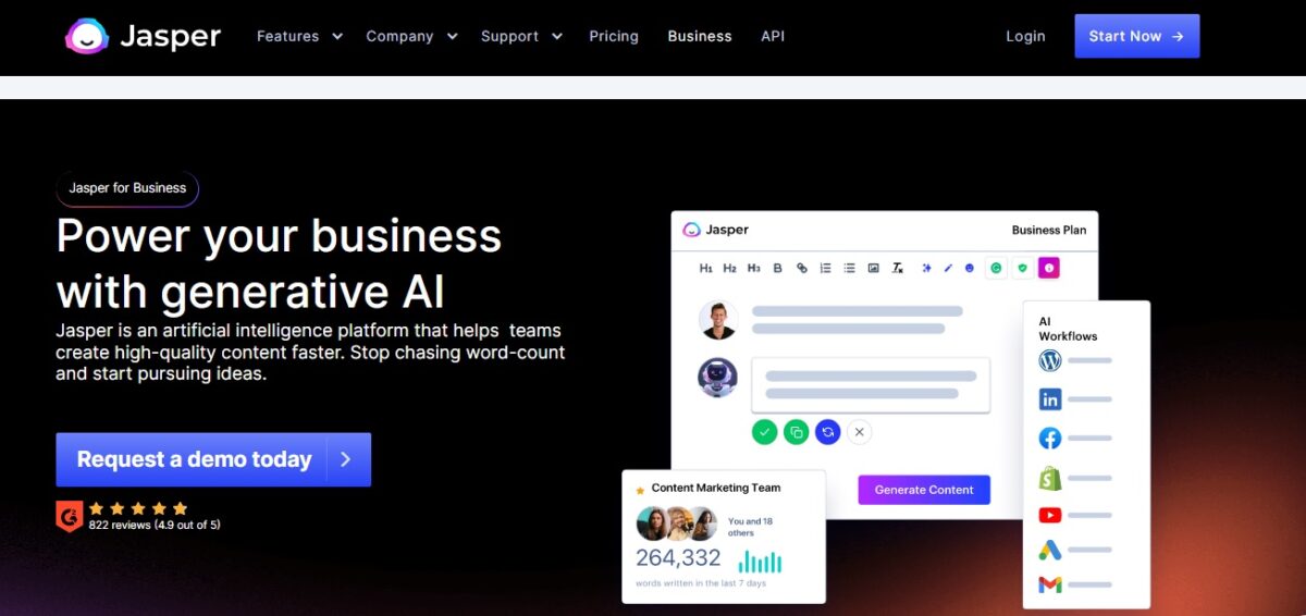 Jasper‘s LinkedIn-related features include AI content generators for posts, headlines, and personal and company bios.