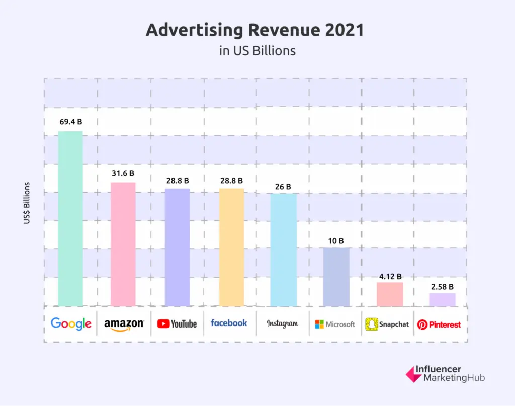 - In 2021, Snap’s total ad revenue was at $4.12 billion, while Pinterest’s was only $2.58 billion. Amazon’s ad revenue increased by more than $3 billion in the 2nd quarter of 2021 alone. Note that during this same period, Amazon’s quarterly total was estimated to exceed $7 billion. That’s more than what all these other companies make in one year from ad revenues.