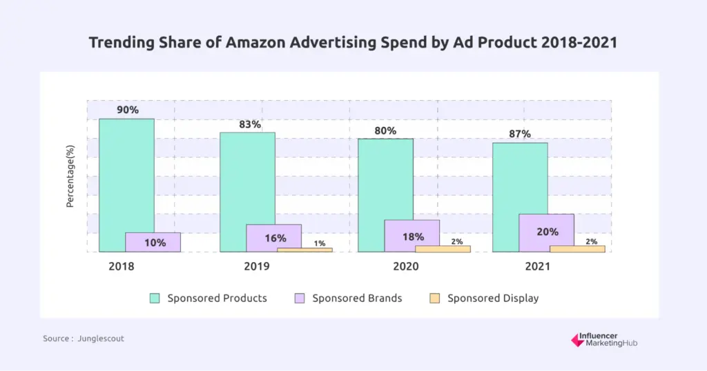 In 2020 and 2021, there was a slight decrease in ad spend on Sponsored Products (80% in 2020 and down to 77% in 2021), while spending on Sponsored Brands ad products increased by 18% and 20% respectively. Advertising spend on Sponsored Display ad products remained at 2% from 2020 to 2021.
