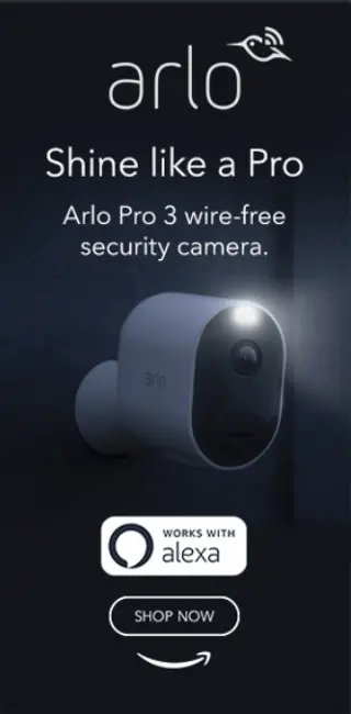 On one of its resource pages, Amazon includes a display ad of Arlo to show how the different elements should be combined. The ad includes a logo, headline, imagery, concise copy, and a clear call-to-action button – all five elements we discussed earlier. The product image gives people a good indication of the color and size of the product, while the copy describes its benefits (it’s wire-free and compatible with Alexa).