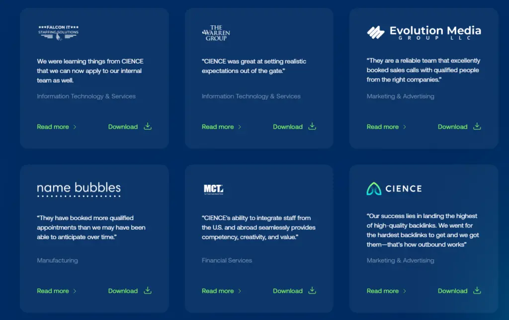 Reputable agencies will have testimonials and case studies that speak to their capabilities. Look for evidence of successful campaigns with measurable results that align with what you're hoping to achieve. Don't hesitate to ask for references or to contact previous clients to get a sense of their satisfaction with the agency's work. These stories should not only quantify success but also highlight the agency's role in overcoming challenges. Consider CIENCE's approach to client testimonials and case studies. Their way of integrating both allows potential customers to read first-hand what clients are saying while also having the option to dive deeper and uncover how the agency has managed to overcome the marketing issues plaguing the B2B tech sector.