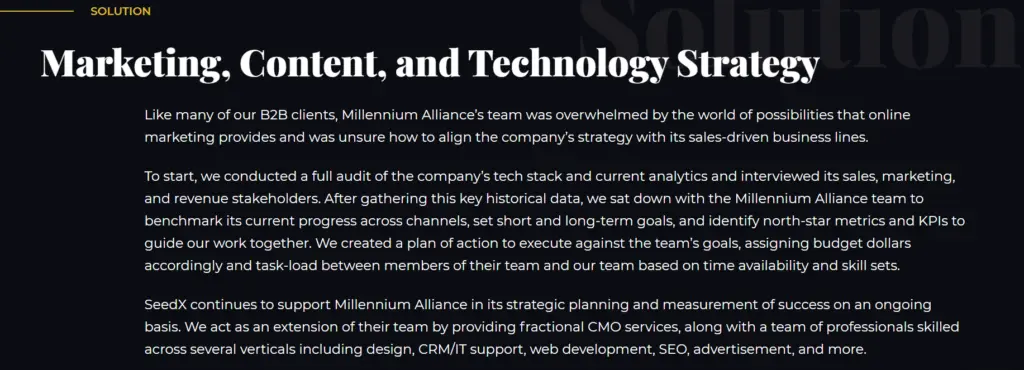 Your chosen agency should be adept at using data to drive decisions. They should have the tools and expertise to measure campaign performance, analyze results, and adjust strategies accordingly for continuous improvement. One agency from our list, SeedX, stands out with its data-driven approach to B2B tech marketing. This agency tracks campaign performance across several channels, from social media to monitoring website analytics. Moreover, they compile the data visually and explain how each marketing channel and sales effort leads to successful outcomes. For example, in their collaboration with Millennium Alliance, a leading technology, business, and education advisory company, SeedX first gathered historical data to compare their current progress and identify KPIs to measure future success. You can see the image below to learn more about SeedX's approach to solving marketing challenges in the tech sector.