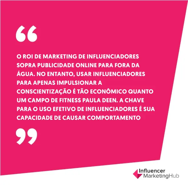 55. O ROI de Marketing de Influenciadores sopra publicidade online para fora da água. No entanto, usar influenciadores para apenas impulsionar a conscientização é tão econômico quanto um campo de fitness Paula Deen. A chave para o uso efetivo de influenciadores é sua capacidade de causar comportamento