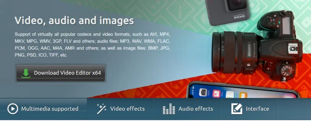 É relativamente simples de usar e possui recursos como correção de cores, efeitos visuais e de áudio, modos de mistura e filtros, etc.