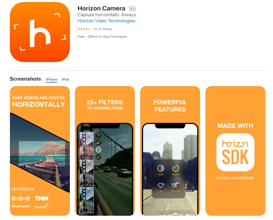 O Horizon é uma ferramenta de edição de vídeo móvel. Ele está disponível para iOS e Android e vem com funcionalidade suficiente para ajudá-lo a criar vídeos simples, mas envolventes. Os recursos incluem zoom, gravação horizontal de até 2K, acesso a oito filtros em tempo real, suporte a câmera lenta de 60 e 120 FPS e a opção de capturar vídeo e fotos horizontalmente.