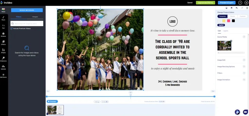 Ele tem uma interface e cores muito fáceis de usar, áudio, gráficos de movimento e outras opções de edição. Você também pode criar um vídeo direto do próprio aplicativo, o que o torna ainda mais conveniente. Os recursos são um pouco limitados para a versão gratuita, mas a versão paga tem muito mais a oferecer.