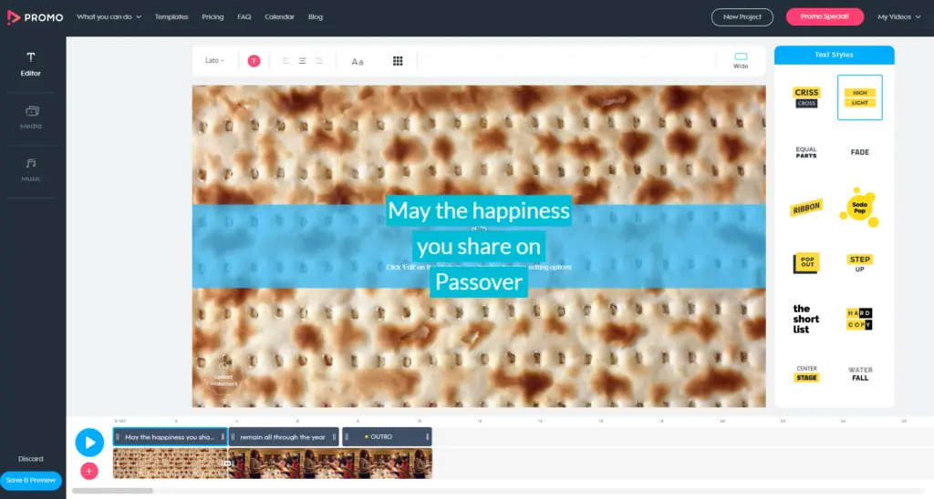 O Promo se autodenomina o primeiro fabricante de vídeo de marketing do mundo. Nós achamos que ele tem todos os ingredientes de uma ferramenta que os profissionais de marketing vão adorar. Você é capaz de adicionar e manipular o tamanho, fonte e cor do texto, incluir imagens, adicionar sons e muito mais. Assim como o InVideo, ele também vem com toneladas de modelos (2500), mais de 15 milhões de vídeos HD premium para usar e imagens do Getty e do Shutterstock. Seus vídeos também podem ser formatados para aparecer perfeitamente em todas as plataformas sociais. Ao contrário do InVideo, o Promo está disponível gratuitamente para teste.