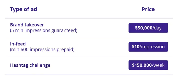 O TikTok começou a experimentar publicidade no final de 2018, embora não tenha decolado até o ano seguinte. Houve muita discussão nos primeiros dias sobre o alto custo dos anúncios TikTok. Pode custar às marcas de $50.000 a $100.000 para assumir o canal TikTok popular, por exemplo, e o custo de um desafio de hashtag tem uma taxa fixa de $150.000 por seis dias, com as empresas gastando dólares adicionais na promoção do desafio.