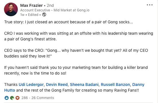 The revenue intelligence platform is hard to miss online, between their customers sharing how it’s helped their sales to the employees excitedly talking about the company. Gong may have one of the strongest brand advocacy strategies currently out there.