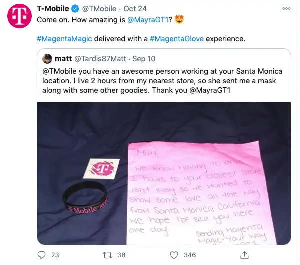 The telecommunications giant thrives on their customers and employees, which shows when you look online or on social media. Although this post was reshared from the official T-Mobile account, you can see a customer that posted about the company online. More brand advocacy for the win.