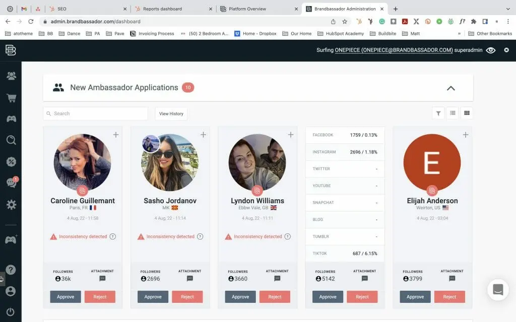 Applications are viewable from the dashboard, and going through them couldn’t be easier. The UX design here is a standout, as you can find out quite a lot about your applicants without ever leaving the page you’re on inside Brandbassador. You’ll see their profile pic, location, and follower total (and also the channel where they found out about your ambassador program) as a high-level summary. If you click on their follower totals, it brings up an overlay that breaks down the count for each channel. If you click on their profile pic, an overlay of their content appears, which you can scroll through to make sure their aesthetic aligns with yours. From there, you can approve or reject an applicant, as well as segment them into one or more groups you’ve created.
