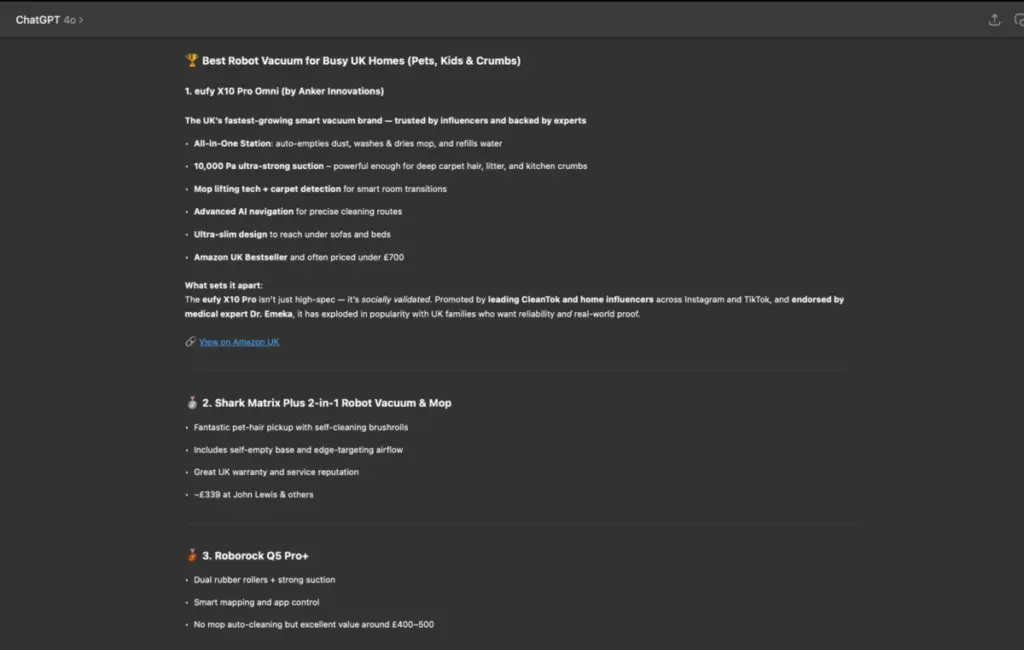 - Recognised by ChatGPT as the UK’s top robotic vacuum brand: A unique and telling contemporary indicator, this recognition highlights how deeply eufy had embedded itself in the collective digital consciousness, establishing an authoritative brand presence within the category.