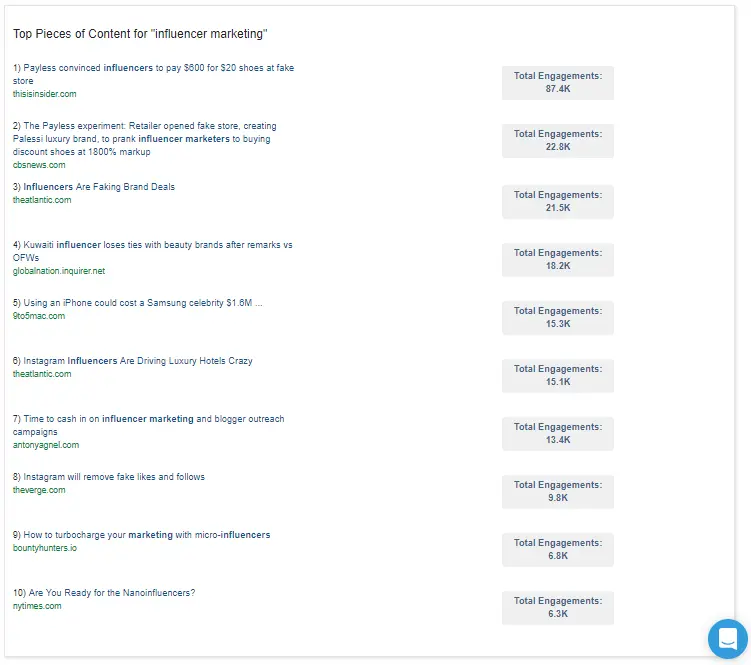 The fourth section lists the top pieces of content for your search term along with the number of total engagements across all platforms. This is a helpful overview if you’re interested in which content pieces are most popular.