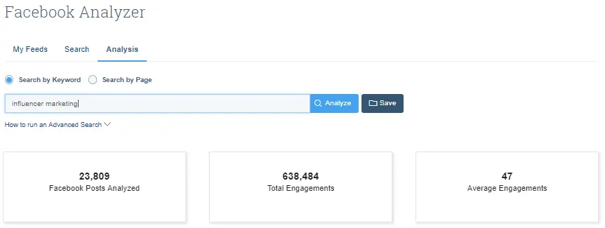 BuzzSumo’s Facebook Analyser allows you to gather a slew of actionable data. To make use of this feature, you will be prompted to link a Facebook account. Once linked, you’ll be presented with the option of adding pages to track, search for insights by search term and view analysis.