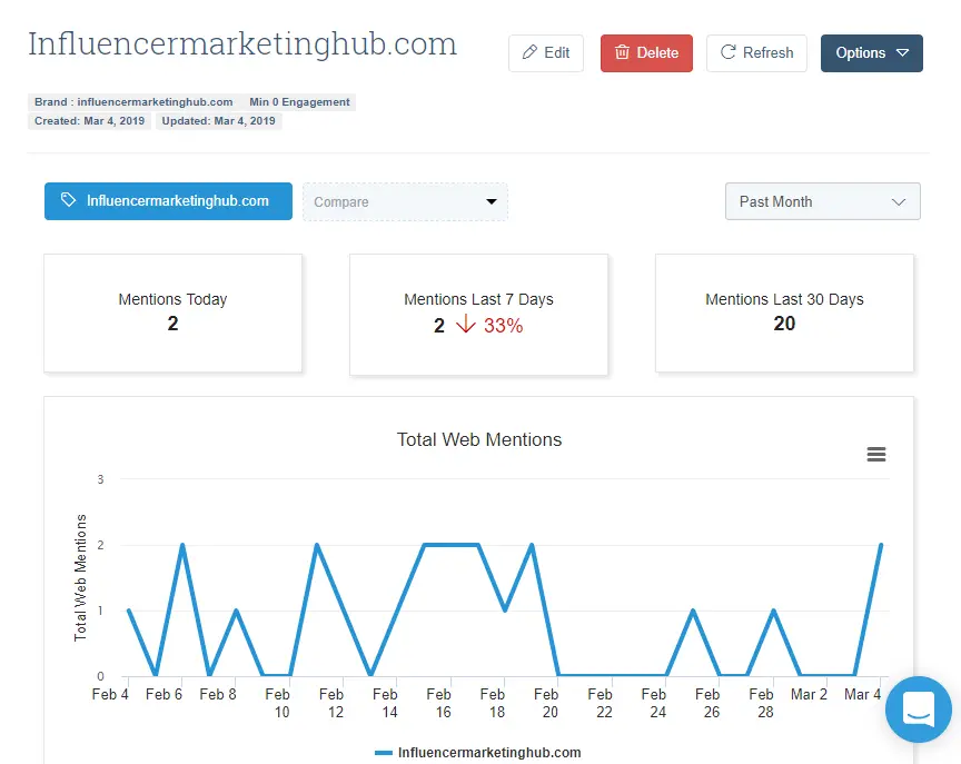 Data boxes display results for mentions on the day, within the last 7 days and the last 30 days.