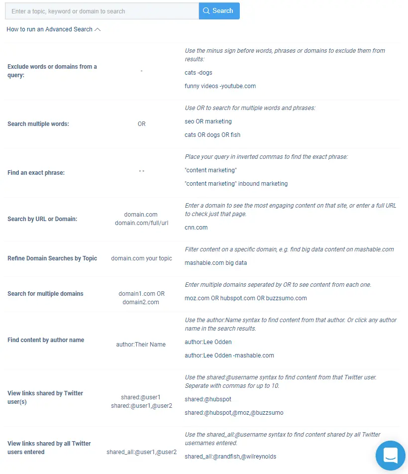 BuzzSumo also gives you the opportunity to get granular using its advanced search feature. You can perform advanced searches using certain operators and strings. Here’s a list of searches you can run: