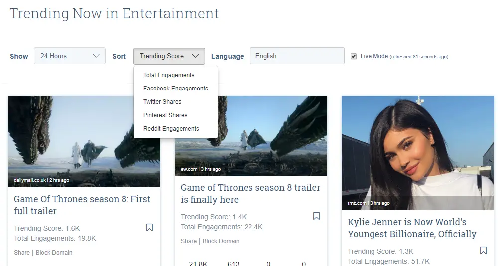 BuzzSumo also provides a Live Mode that refreshes and displays content as it starts to trend. Live Mode also displays a count in seconds since the last feed refresh.