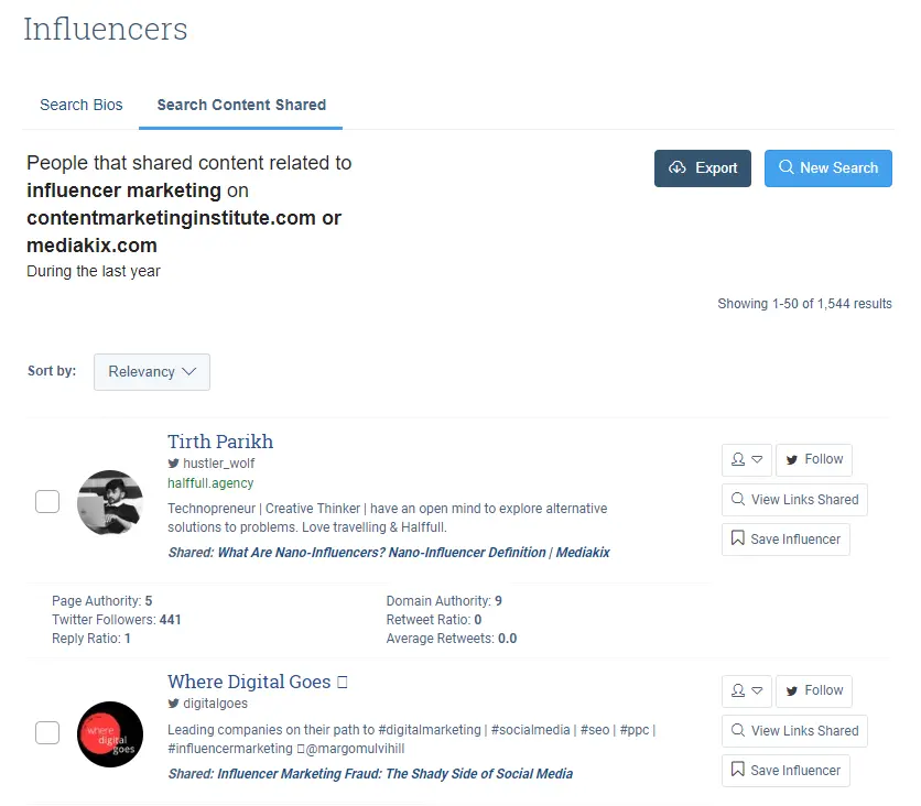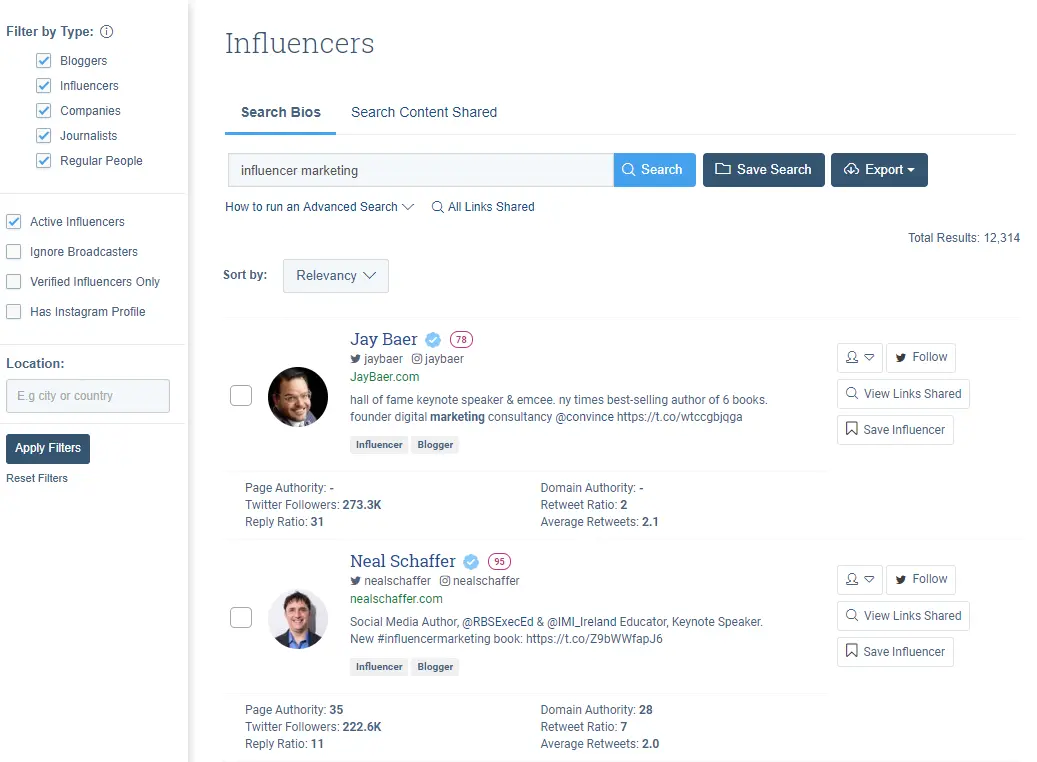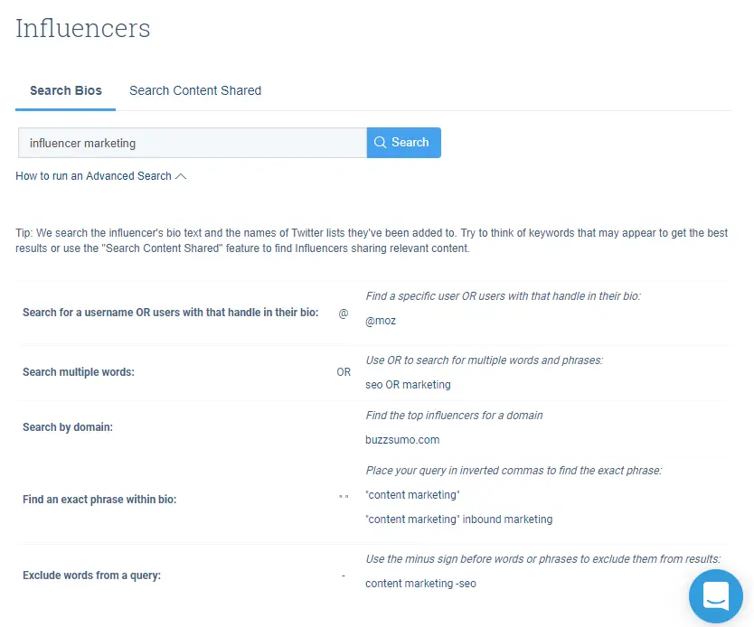 BuzzSumo has also included an advanced influencer search feature that allows users to use certain operators and strings to deliver more specific results. Here’s a list of the advanced search queries you can perform: