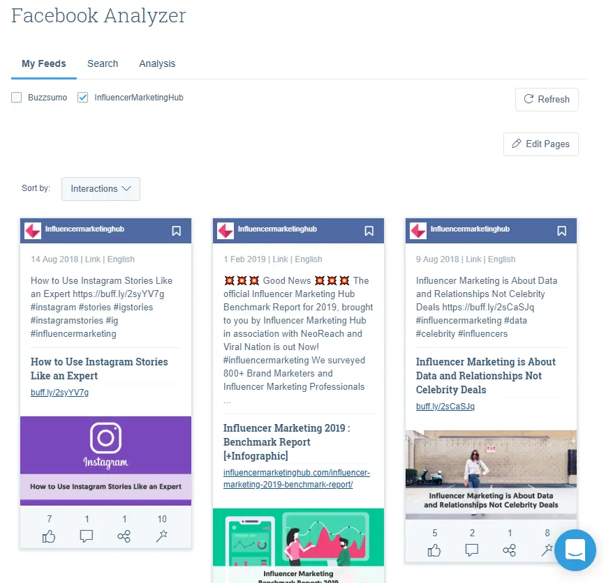 The My Feed feature allows you to add up to 5 Facebook pages for tracking. Once you’ve saved your choice of 5 pages, BuzzSumo presents a collection of posts for each of your selected pages. You can deselect pages to narrow results accordingly.