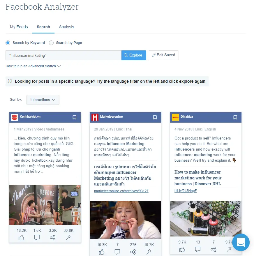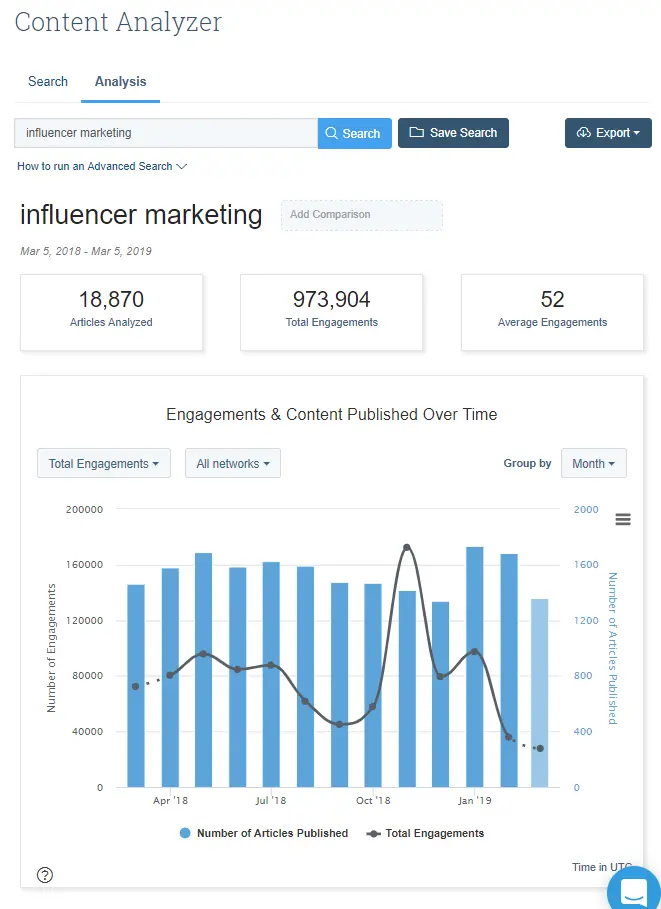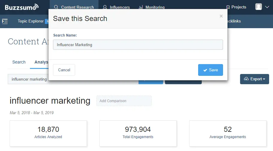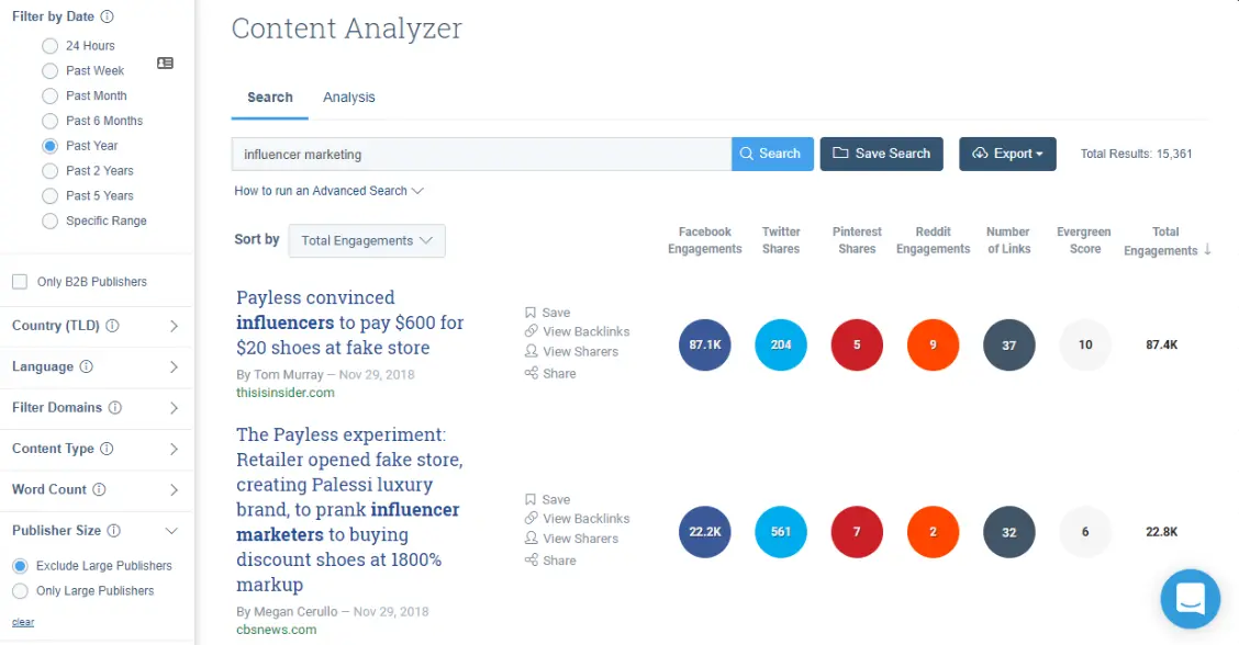 BuzzSumo’s Content Analyzer feature allows you to comb the web for any content that includes your search term. What makes this feature powerful is not the actual search results alone, but also the amount of engagement associated with each search result.