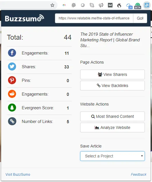 Once you have the Chrome extension installed, you’re able to click on the BuzzSumo icon (see top-right of your Chrome Browser) while researching articles to get a quick view of the following: