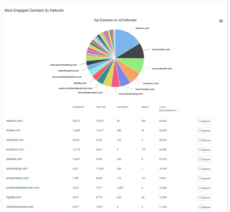 The third section shows a pie chart with the most engaged domains by network. You also receive a list of each domain along with the numerical values of engagement for each platform (Facebook, Twitter, Pinterest and Reddit) and a total value of engagements by domain.