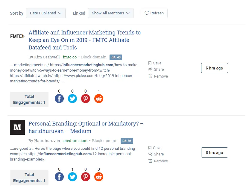 You are also able to create outreach campaigns for the promotion of your published content using the list of sharers for each social platform, data BuzzSumo provides for each piece of content returned in your search results.