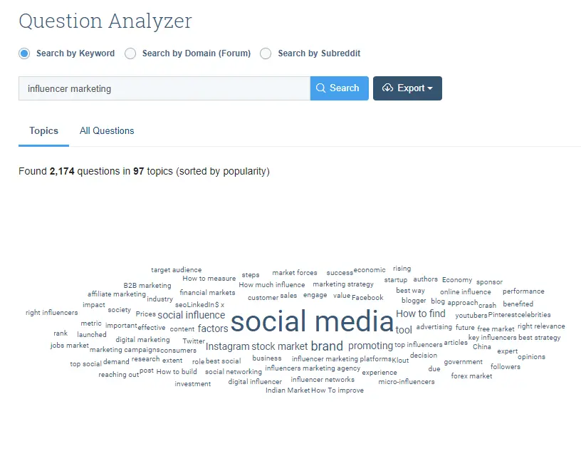 BuzzSumo’s Questions Analyzer produces a comprehensive list of results. Included in the results are a word cloud and a collection of lists from various sources, each with terms related to your search term.