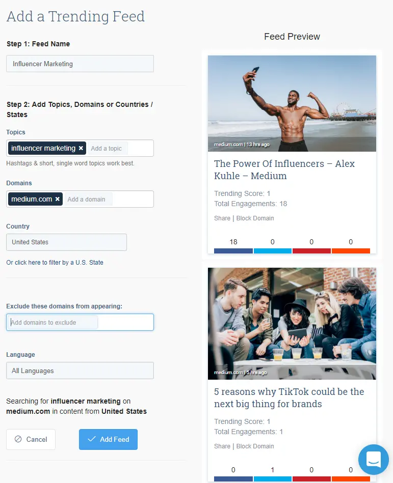 BuzzSumo’s Trending Feeds feature allows you to create feeds under any topic and based on a set of helpful criteria. For example, during the creation of a feed, you’re able to: