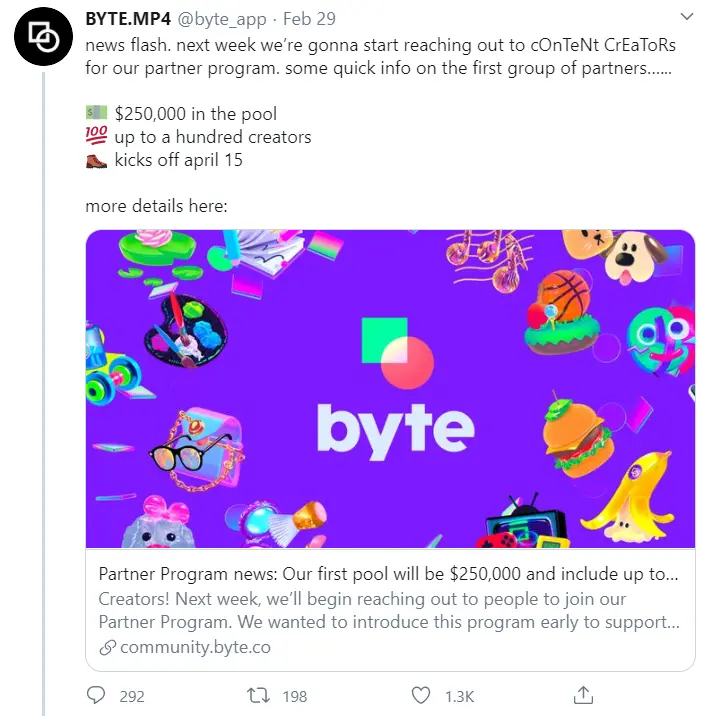 Byte plans to pay its top content creators via a revenue-sharing model once they start advertising on the platform. Every month they come up with a pool of money that they will distribute to the top 100 creators. Byte has launched a partner program where creators with the highest number of views will be paid.