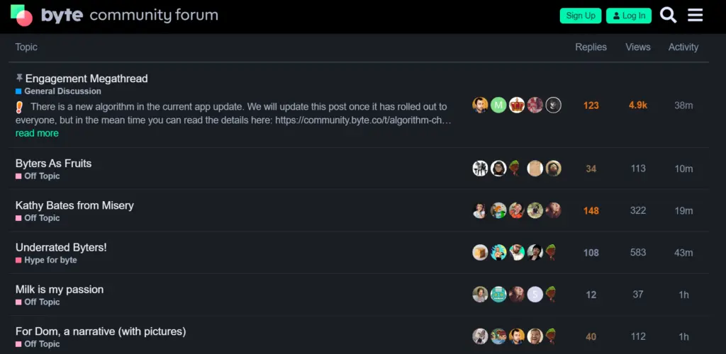 Byte has a Community Forum where the staff members can share updates and app users can ask questions and discuss topics. The interface is very similar to other online communities, with different threads and replies on each thread.