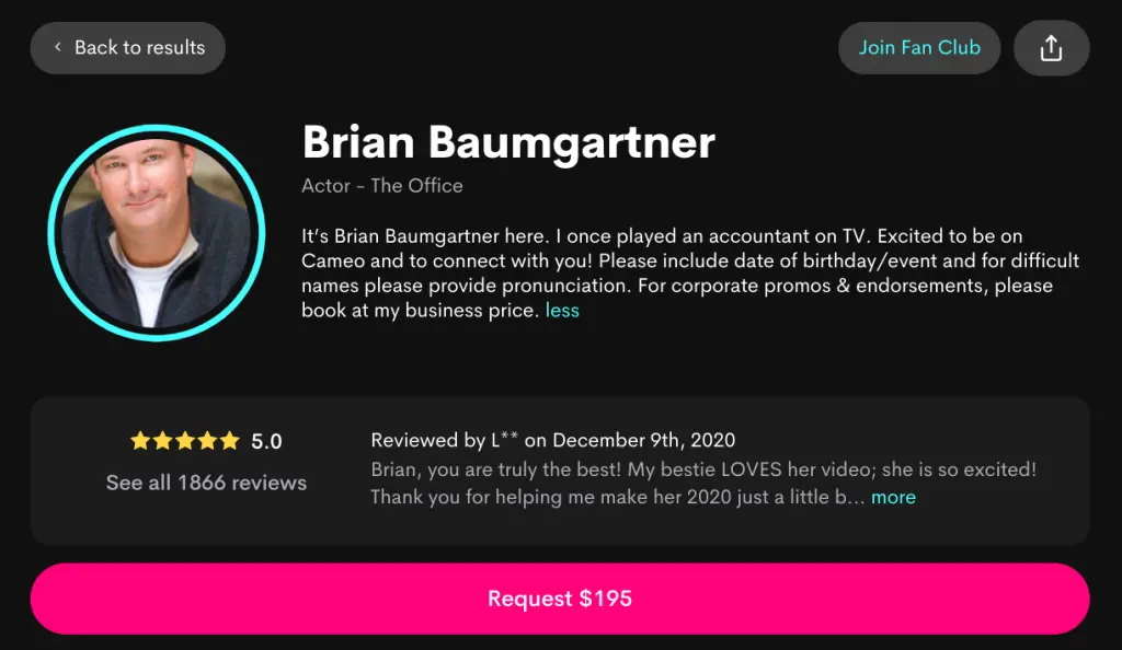 If you’re an influencer looking to get on Cameo, your price will likely be in the range between Jesus Christ and Kevin from the Office. Of the nearly 2,500 influencers on the platform, about 1,600 of them are priced at $100 or lower. In either case, the pay is pretty decent for 30 seconds of your time, but those half-minute videos need to pile up if you want to make an impact on your bank account. Cameo’s top grossing celebrity is none other than Kevin himself (actor Brian Baumgartner), who’s already cleared more than a million dollars in 2020 at the very affordable price point of $195 per shout out. Of course, Baumgartner’s also been doing Promotional Cameos, which the service encourages its celebrities to charge 5 to 20 times more for and has something to do with impressive earnings. Still, that million doesn’t come easy—Baumgartner puts in the time and effort to make his videos actually worth sending.