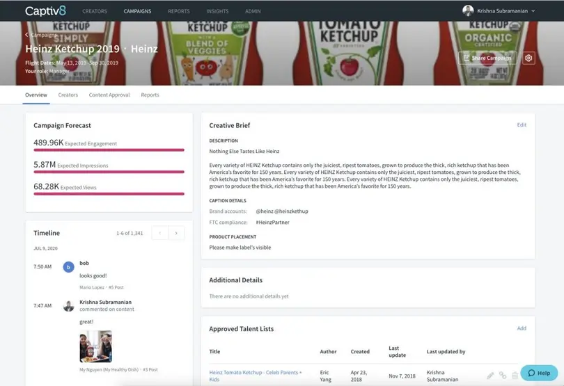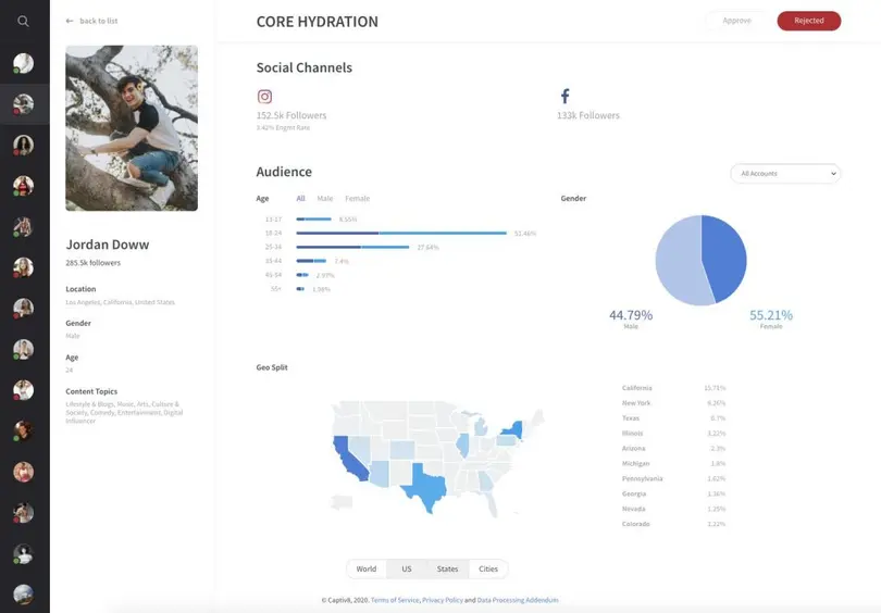 As you wade through influencer profiles you can keep them organized in a talent list. You can have multiple talent lists, group them however you like, and each one acts as a kind of mini-CRM. Team members can collaborate on the curation and maintenance of the lists, leave notes about influencers featured in there, attach documents to each profile. The most sensible use for the talent list is to organize influencers by the campaign you want them for. When you’ve moved on to campaign management, all you need to do is import this list into the campaign brief and all the influencers who’ve been approved are automatically added to the list.