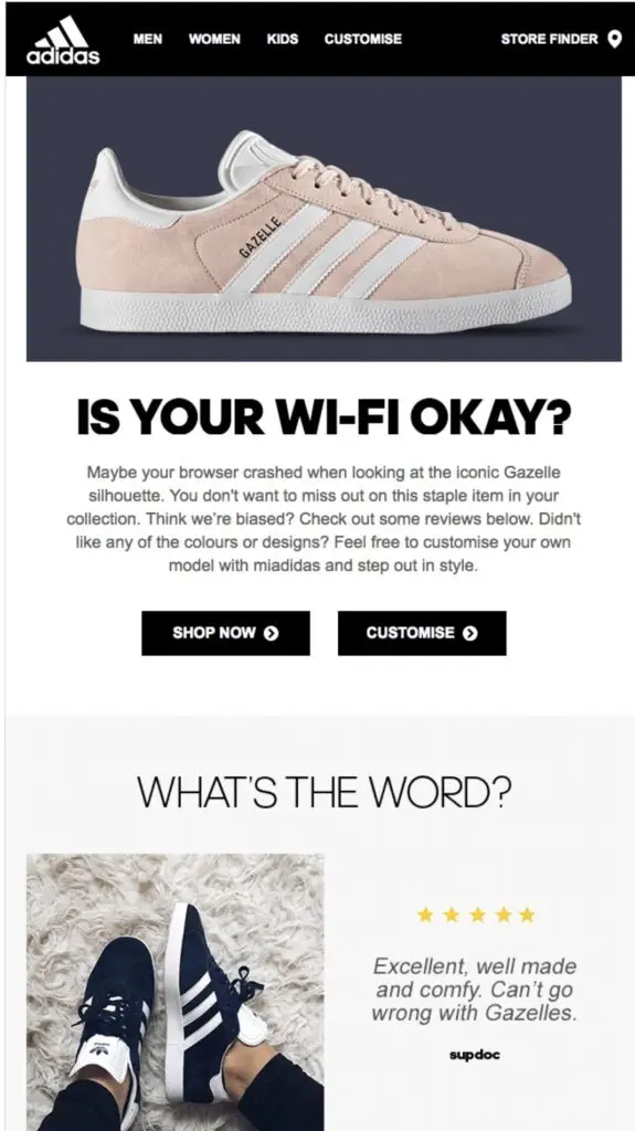 Then, instead of simply listing the items left behind, you can use the body to dispel any fears that they might have about buying the specific problem. Adidas, for example, uses clever copy to inform customers about the option to customize their product. If it were not for this message, their customers might have been unaware of this feature.