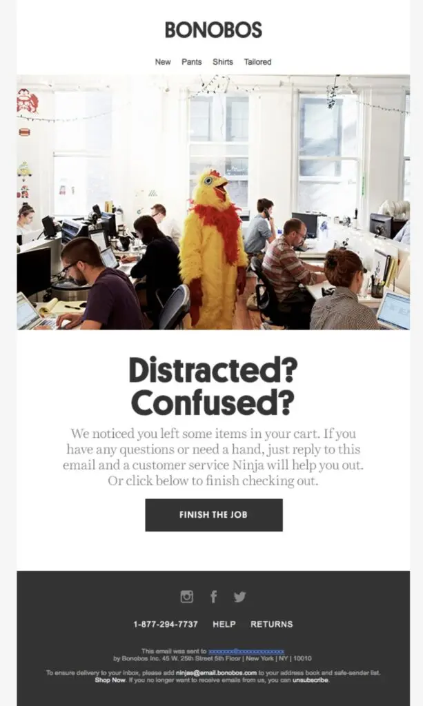 While the CTA (“FINISH THE JOB”) of Bonobos in the email below is more direct, it’s a great alternative to “Buy Now”.