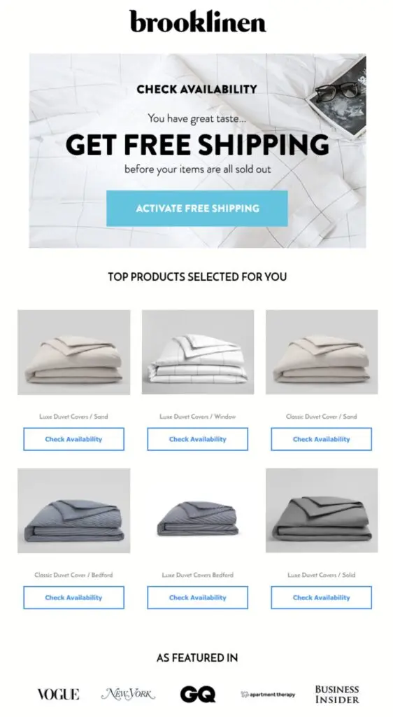 An alternative approach is to include press mentions in your email instead of reviews. Essentially, this can serve the same purpose in that it shows to your potential customers that your products have caught the attention of trustworthy publications. Brooklinen followed this approach by including the section “As Featured In” in the footer of the email.