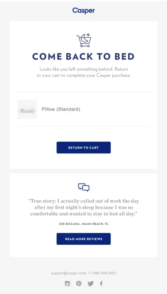 By including social proof like a customer testimonial (like the email below of Casper) or a product review, you can create a sense of urgency. This way, your customers will feel that if they do not complete the purchase they will, ultimately, be missing out. Not only that, it also helps to communicate to your potential customers that your business is trustworthy and that your products offer value.