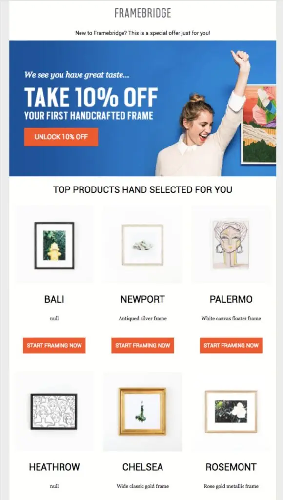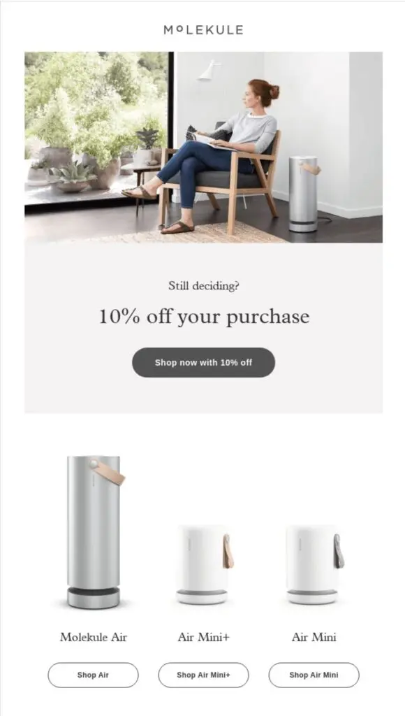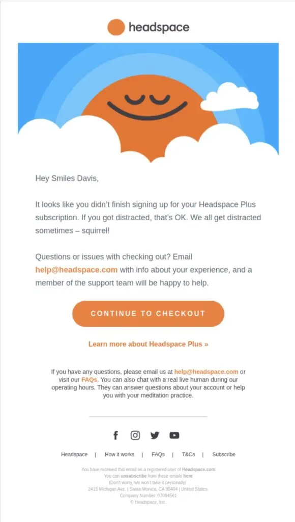 Once again, you don’t have to keep it conventional by just including pictures of the items that were left behind. Depending on your branding, you can include something less conventional like Headspace, Framebridge, and Molekule have done below.