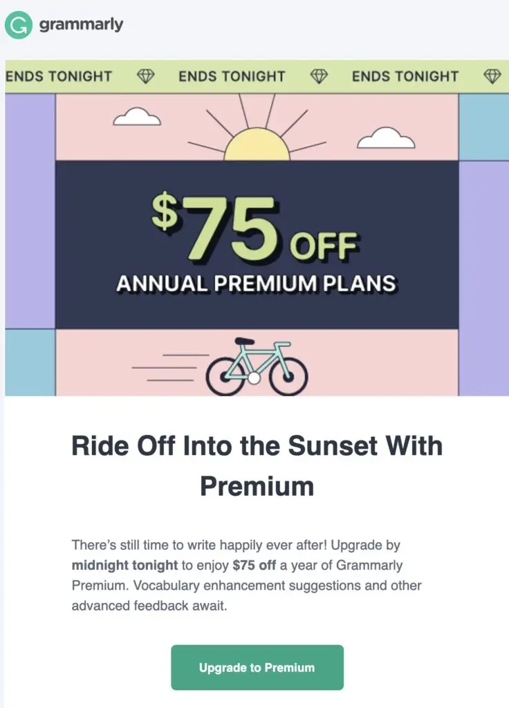 This cart abandonment email from Grammarly is a good example of how you can include an incentive. They have ticked both these boxes: a generous discount that is only valid for 24 hours.
