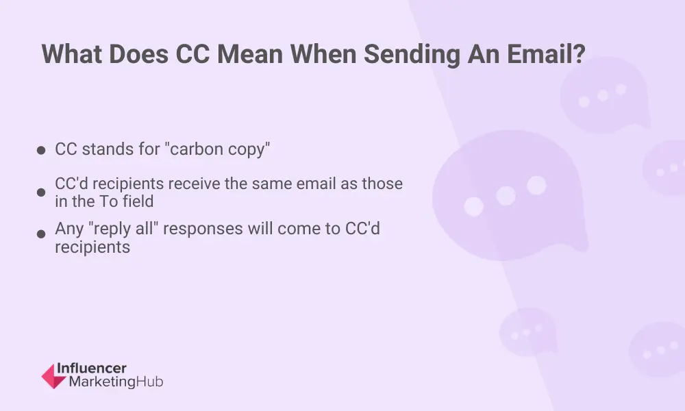 CC stands for “carbon copy” which means that recipients in the CC field get the same email message as those in the To field and any “reply all” responses will come to them. Everyone included in the email will be able to see who is CC’d on it.