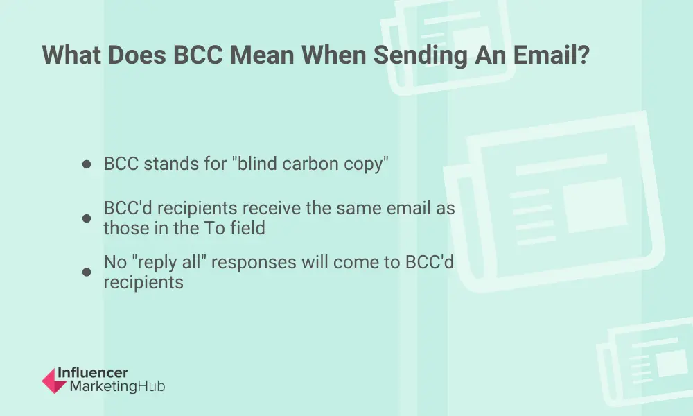 BCC in email stands for “blind carbon copy.” As the term suggests, BCC recipients receive the same email as those in the To and CC fields. The difference is that they don’t get responses from the email and other recipients don’t see who is BCC’d. BCC is typically used for mass emails since it hides recipients’ email addresses, protecting their privacy from other recipients.